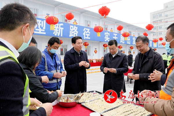 在陜建十二建高新區(qū)路網(wǎng)項(xiàng)目工地,趙俊民一行親切看望響應(yīng)號召留守安康、就地過年的施工人員,并同大家一起包餃子、吃團(tuán)年飯,共同分享迎新納福的喜悅。趙俊民勉勵(lì)大家,無論來自何方、家在何處,都是推動(dòng)發(fā)展的建設(shè)者、參與者、見證者,希望大家在安康舒心過節(jié)、安心工作。各級各部門要強(qiáng)化政策落實(shí)和保障措施,為就地過年人員提供良好的工作和生活環(huán)境,讓他們以安康為家,歡歡喜喜地過個(gè)幸福年。