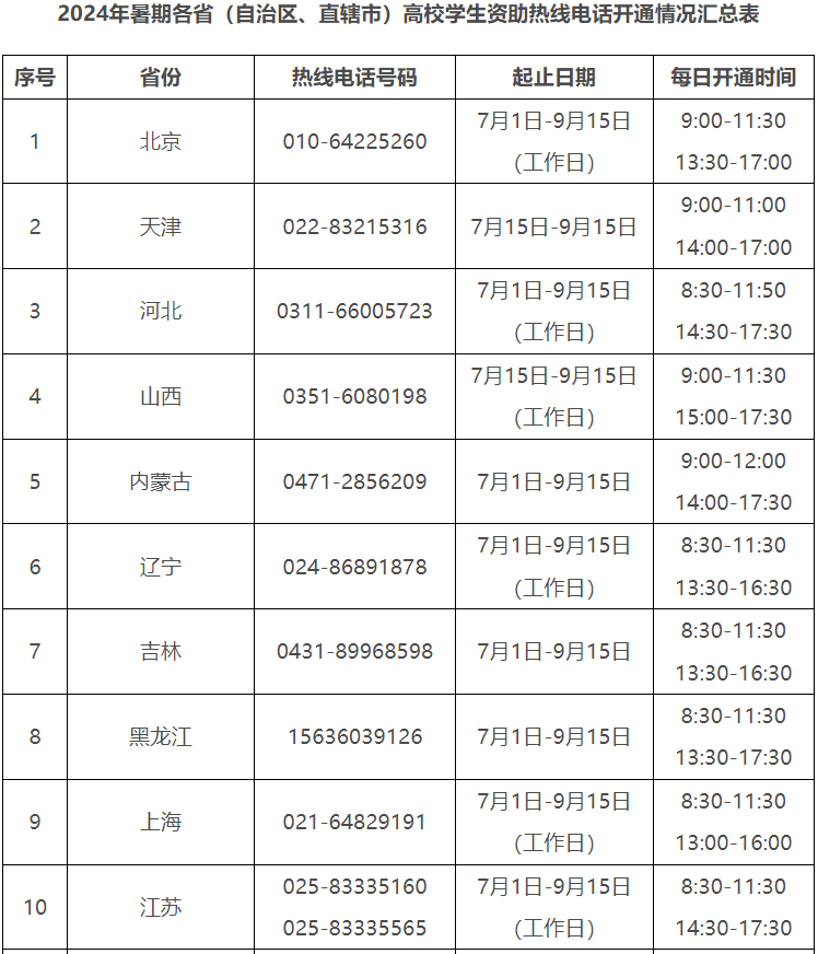 今年暑期,教育部將繼續(xù)開(kāi)通高校學(xué)生資助熱線電話,號(hào)碼為010—66097980、010—66096590,受理時(shí)間為7月1日—9月15日,每天8:00—20:00,為大學(xué)新生特別是家庭經(jīng)濟(jì)困難的大學(xué)新生提供資助政策咨詢與幫助。