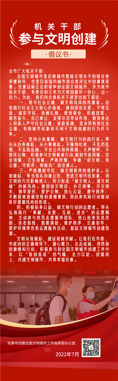 全國文明城市是反映城市整體文明水平的綜合類榮譽(yù)稱號(hào),也是目前國內(nèi)城市綜合類評(píng)比中的最高榮譽(yù)。安康目前正在積極爭創(chuàng)全國文明城市,作為我市機(jī)關(guān)干部,有責(zé)任和義務(wù)為文明創(chuàng)建盡一份心、出一份力。為此,我們向全體機(jī)關(guān)干部發(fā)出如下倡議: