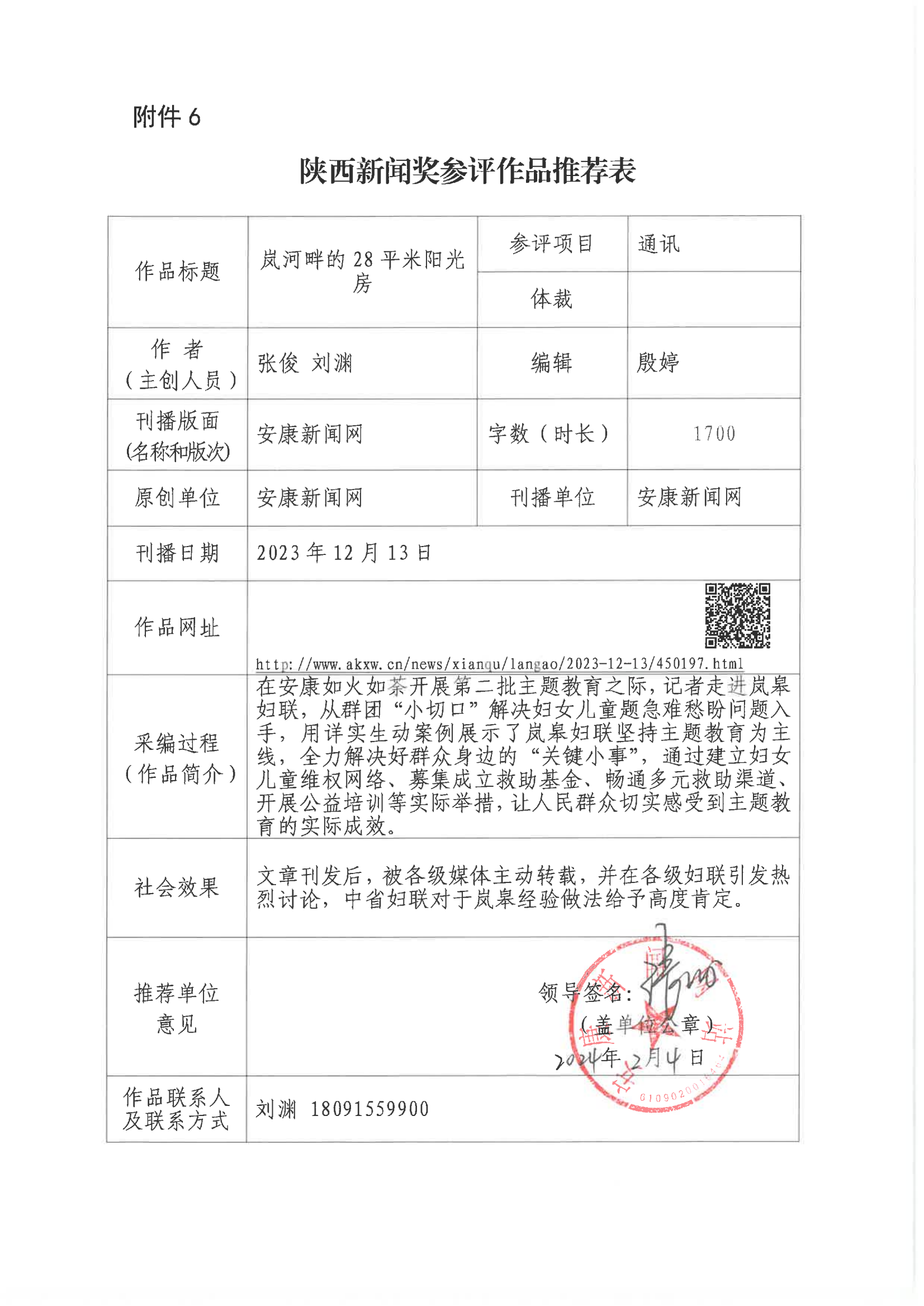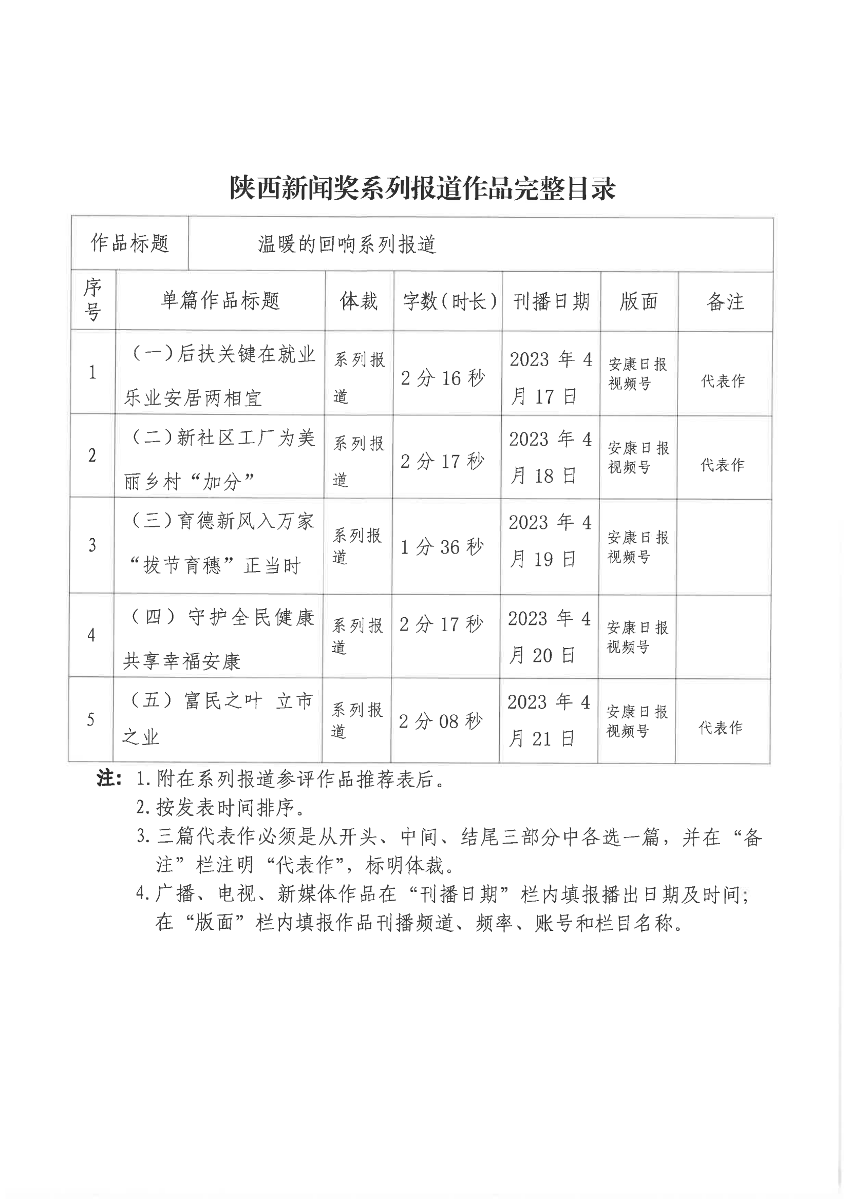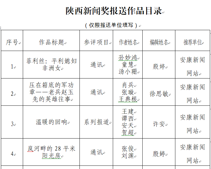 經(jīng)過1月30日編委會(huì)推薦、社黨委研究決定,擬推薦以下4件新聞作品參評(píng)2023年度“陜西新聞獎(jiǎng)”。公示時(shí)間從2024年3月6日至2024年3月12日,公示期為5個(gè)工作日。如有不同意見,請(qǐng)向安康日?qǐng)?bào)社機(jī)關(guān)紀(jì)委、新聞管理部反映。RAj安康新聞網(wǎng)
