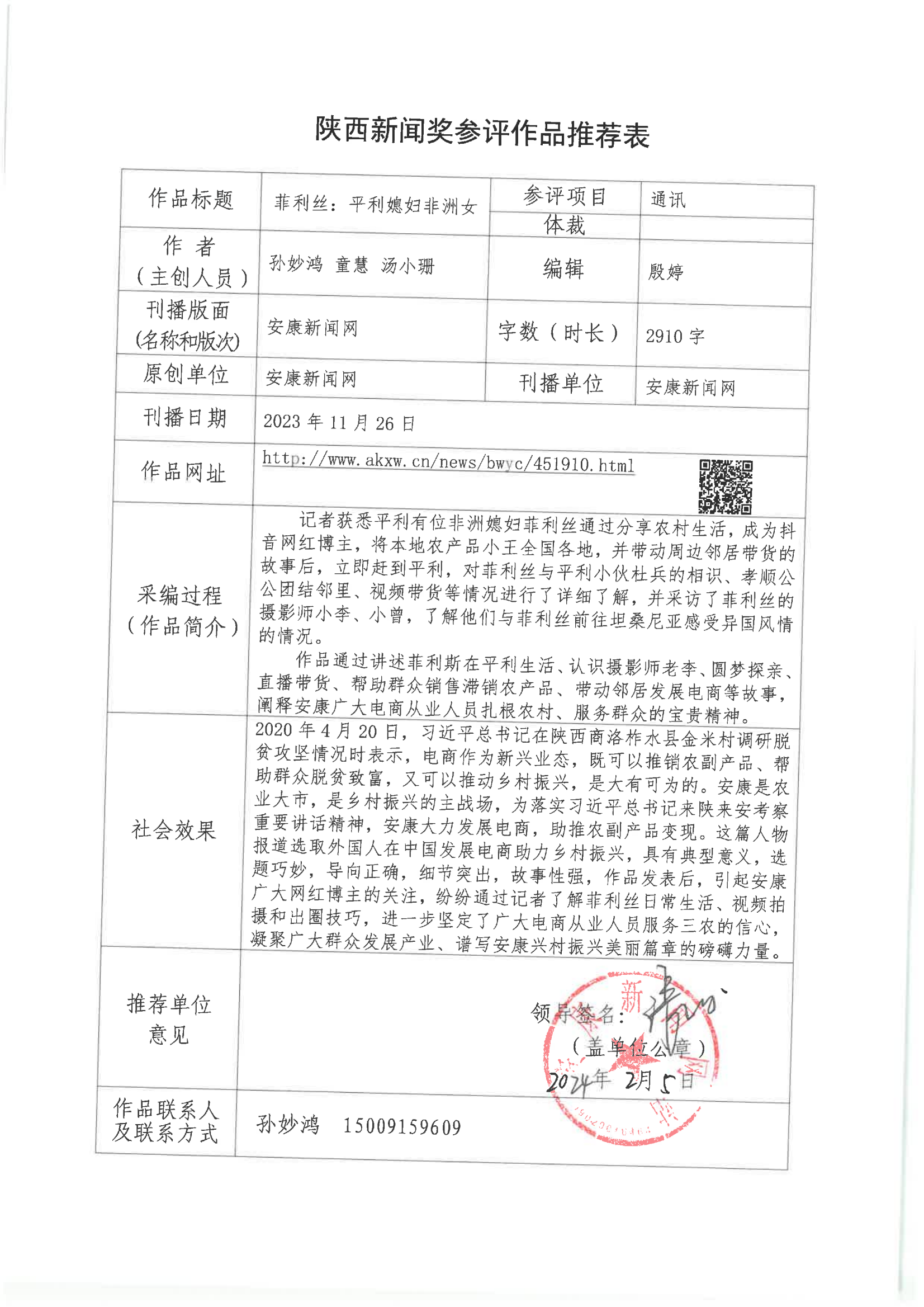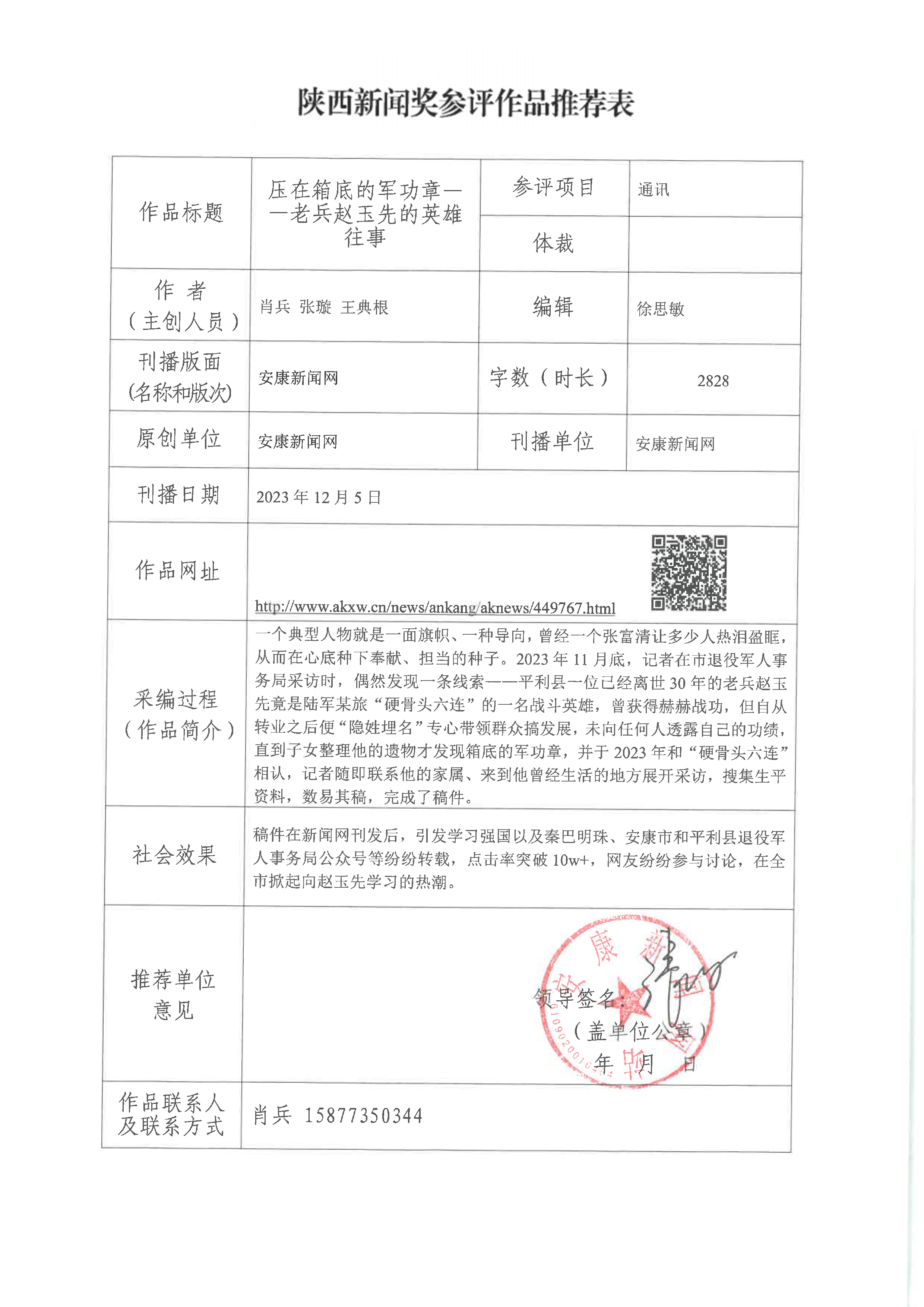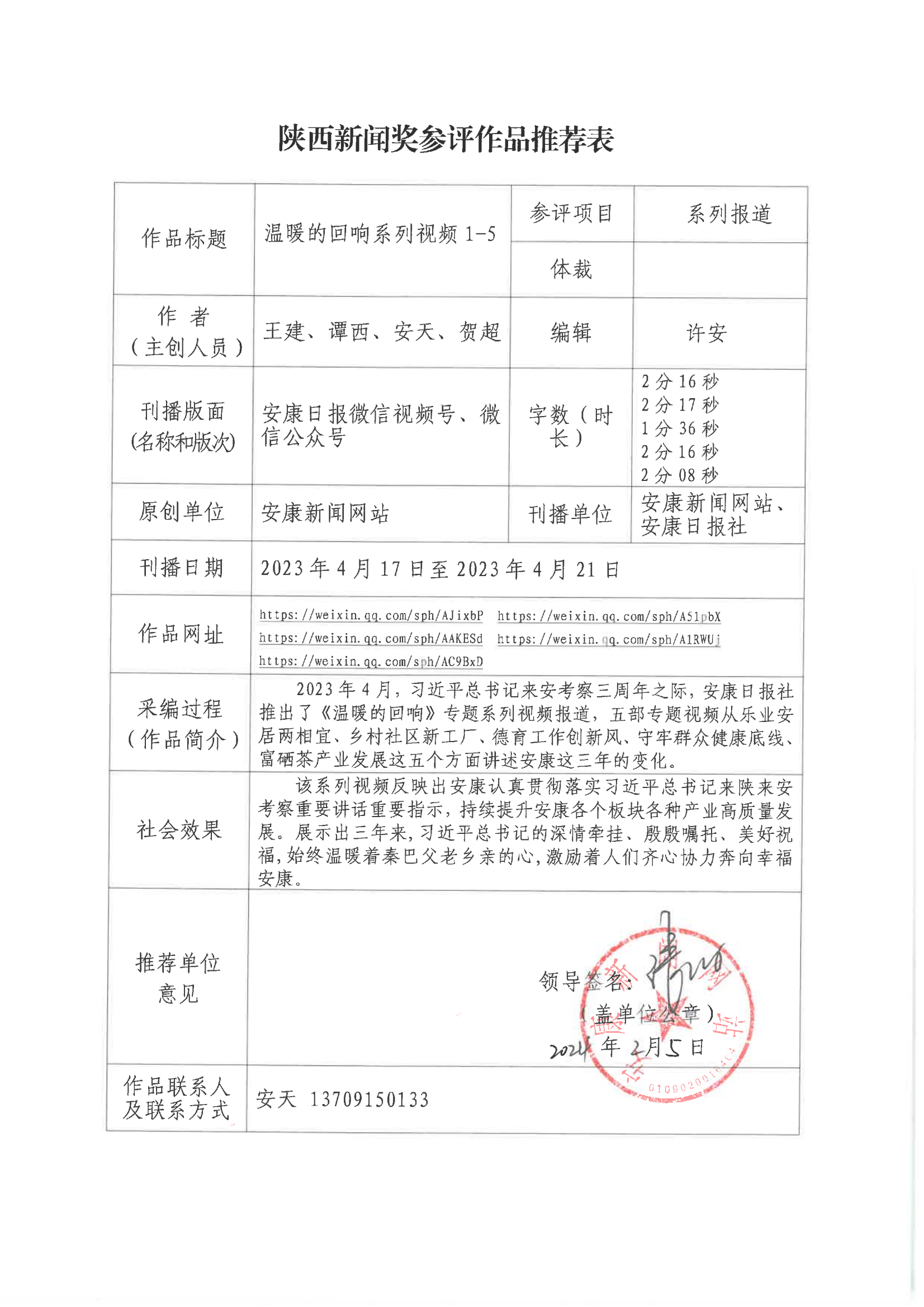 經(jīng)過1月30日編委會(huì)推薦、社黨委研究決定,擬推薦以下4件新聞作品參評(píng)2023年度“陜西新聞獎(jiǎng)”。公示時(shí)間從2024年3月6日至2024年3月12日,公示期為5個(gè)工作日。如有不同意見,請(qǐng)向安康日?qǐng)?bào)社機(jī)關(guān)紀(jì)委、新聞管理部反映。RAj安康新聞網(wǎng)