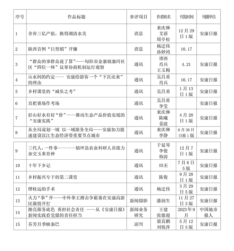 經(jīng)過1月30日編委會推薦、社黨委研究決定,擬推薦以下15件新聞作品參評2023年度“陜西新聞獎”。公示時間從2024年3月6日至2024年3月12日,公示期為5個工作日。如有不同意見,請向安康日報社機(jī)關(guān)紀(jì)委、新聞管理部反映。RQa安康新聞網(wǎng)
