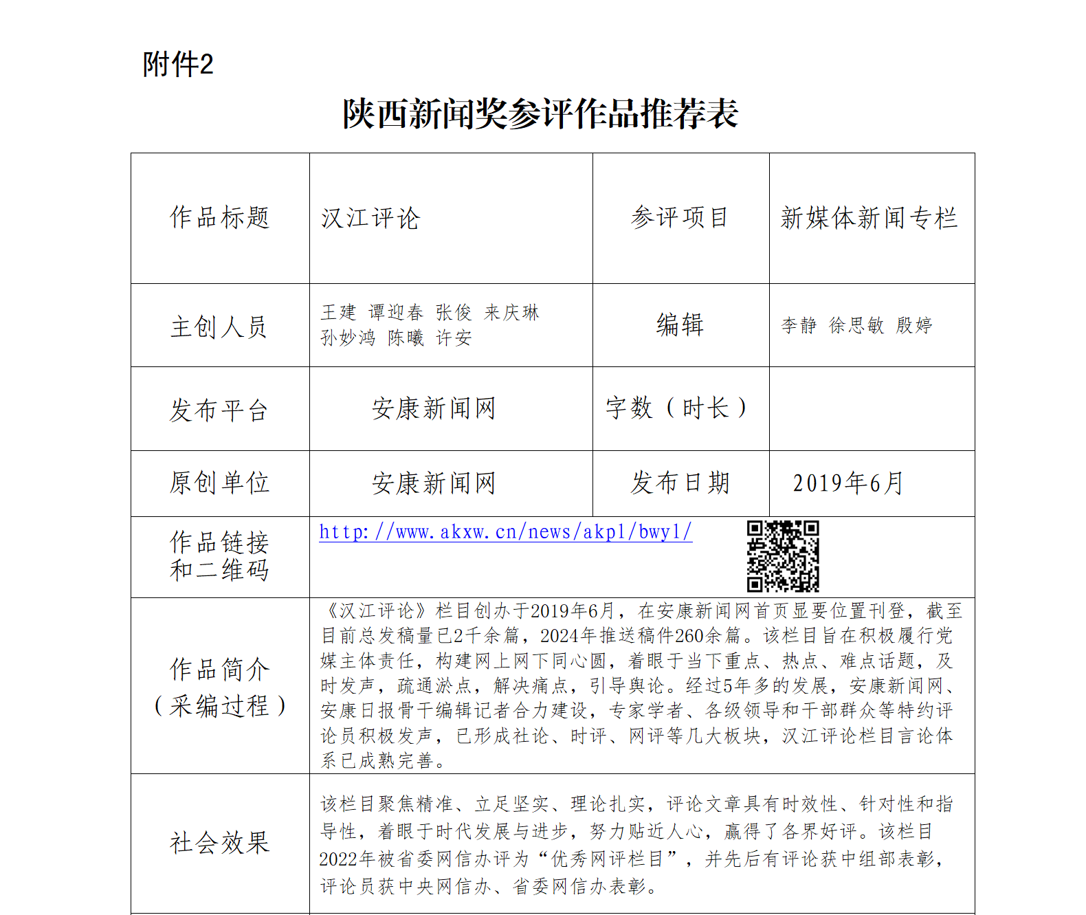經過社黨委研究決定,擬推薦以下2件新聞作品參評“2024年度陜西新聞獎融合報道、應用創(chuàng)新和新媒體新聞專欄”。公示時間從2025年1月6日至2025年1月10日,公示期5個工作日。如有不同意見,請向安康日報社機關紀委、新聞管理部反映。zRn安康新聞網