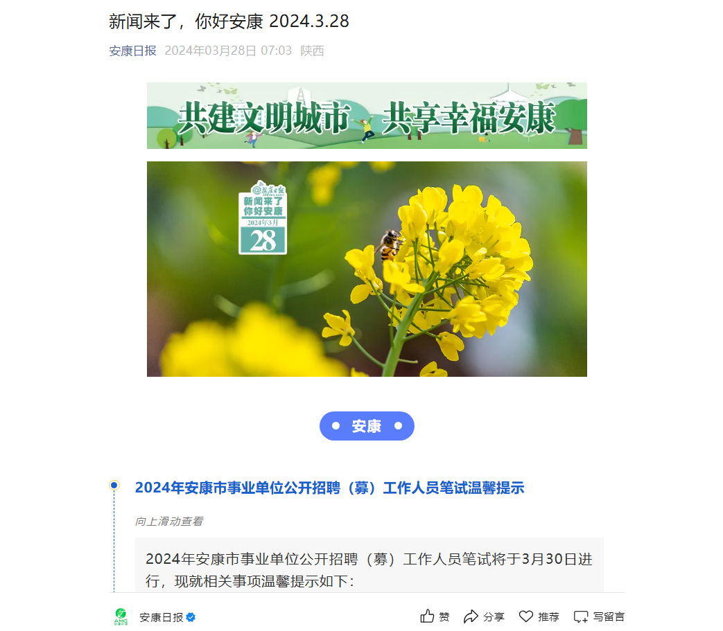 由安康日報社、安康新聞網(wǎng)運維的“安康發(fā)布”微信公眾平臺圍繞“聚焦重點政務新聞推送、深化政務公開、做好政策宣傳,助推政務服務”,著力打造政策宣傳、權威可信的內容體系,整體傳播影響力、服務水平和引導能力不斷提升。累計推送推文900余期,推文1400余條,總閱讀次數(shù)95.8萬次。堅持民生視角,做強“服務力”,走好“網(wǎng)上群眾路線”,不斷深化完善“政務+服務”理念,圍繞就業(yè)就學、交通出行、重要天氣預報等民生消息,科學全面細致做好內容發(fā)布。