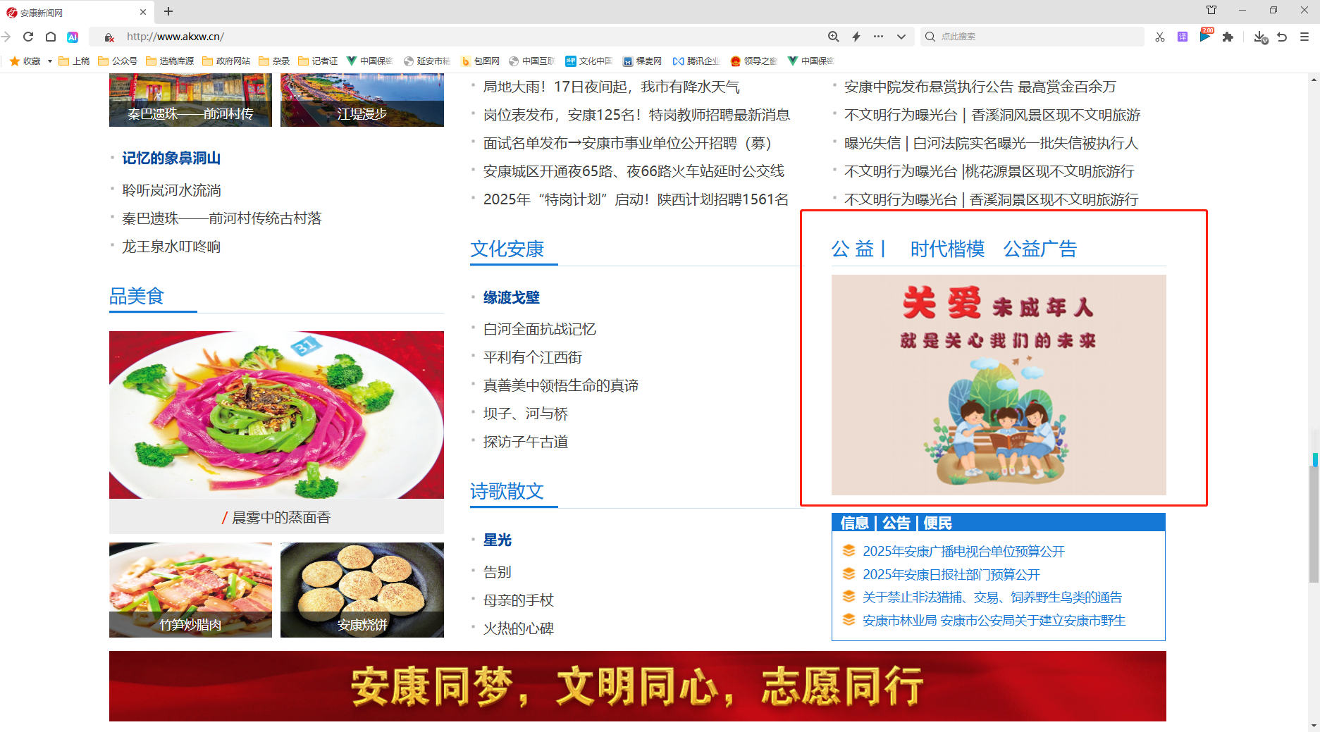 網(wǎng)站首頁設置“公益”模塊,多頻次發(fā)布時代楷模、公益創(chuàng)文、道德模范等內容的公益廣告131條。安康新聞網(wǎng)還積極開展支部“三聯(lián)”共建,助推鄉(xiāng)村振興,廣泛參與到文明創(chuàng)建、交通志愿服務、義務植樹、文化下基層等公益活動。
