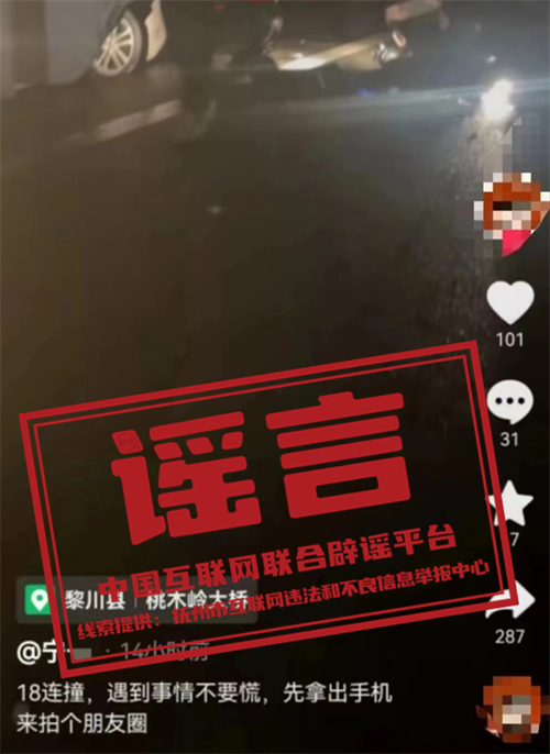 真相:近日,有網(wǎng)民在某網(wǎng)絡(luò)平臺發(fā)布“江西黎川境內(nèi)福銀高速贛閩交界處發(fā)生一起18車連撞重大交通事故”的視頻。經(jīng)向?qū)俚馗咚俳痪藢?shí),黎川高速路段并未發(fā)生18車連撞事故,該視頻信息系謠言。目前,警方已依法對散布網(wǎng)絡(luò)謠言視頻者予以行政處罰,并責(zé)令其刪除相關(guān)不實(shí)視頻。(來源:“撫州網(wǎng)警”微信公眾號)