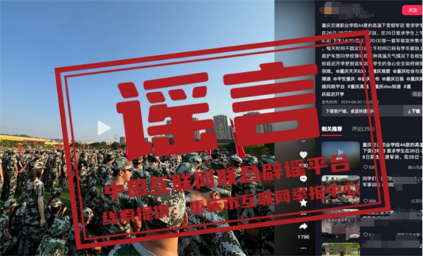 真相:近日,某網(wǎng)民發(fā)布視頻并配文稱“重慶交通職業(yè)學院要求新生在44度的天氣下進行軍訓,已經(jīng)有學生暈倒被抬上救護車”,引發(fā)關(guān)注。經(jīng)向重慶交通職業(yè)學院核實,近期學院未安排開展任何軍訓活動,更不存在有學生因為高溫天氣軍訓暈倒的情況。目前,屬地公安部門已對造謠者展開進一步調(diào)查。(來源:“重慶辟謠”微信公眾號)