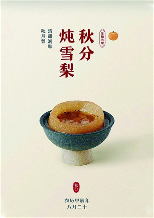 秋風(fēng)漸起,寒涼氣息加重。秋分時(shí)節(jié)在飲食調(diào)養(yǎng)方面,應(yīng)多喝水,吃清潤(rùn)的食物。圖⑦設(shè)計(jì)的中心元素是冰糖燉雪梨,象征秋季的清潤(rùn)與養(yǎng)生,也暗示了秋分時(shí)節(jié)陰陽(yáng)調(diào)和、天地平衡的自然哲理。