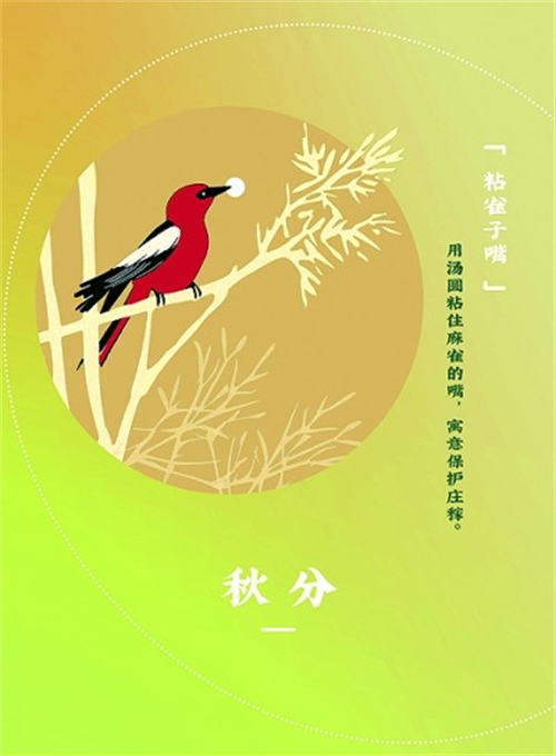 秋分的另一個(gè)有趣習(xí)俗是“粘雀子嘴”,即用一些沒有餡兒的糯米團(tuán)子,以竹簽串好插在田間地頭,喂食給鳥雀,寓意“粘住麻雀的嘴”,以保護(hù)莊稼、確保糧食收成。圖⑤作品采用橙黃和黃綠色調(diào),營(yíng)造出秋日的溫暖氛圍;海報(bào)中央的圓形圖案框是湯圓的抽象再現(xiàn),圓框內(nèi)麻雀站在枝頭,嘴中叼著軟糯的湯圓,形象地展現(xiàn)了“粘雀子嘴”的習(xí)俗。