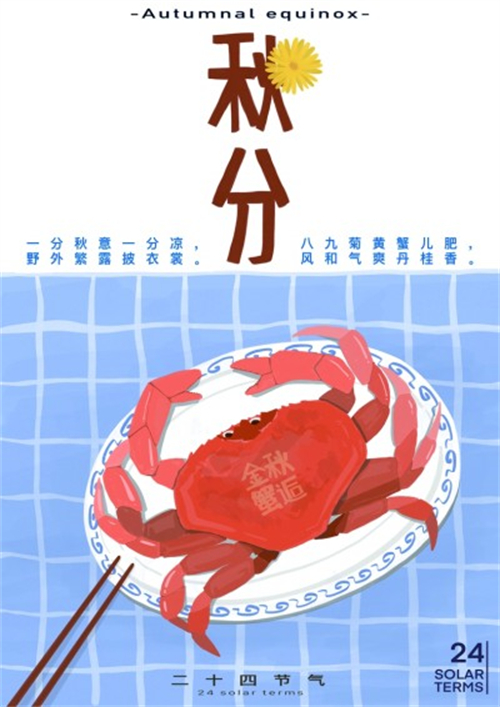 “秋風(fēng)起,蟹腳癢,菊花開,聞蟹來。”把酒持螯,真可謂一件樂事。圖⑥畫面中央的大閘蟹紅艷誘人,寓意豐收與團(tuán)圓;白色盤子與藍(lán)色格子桌布相映成趣,增添節(jié)日溫馨感;黃色的菊花與“秋分”字樣相襯,融合了中國(guó)傳統(tǒng)元素與現(xiàn)代審美,傳遞出濃厚的秋分節(jié)氣氛圍。
