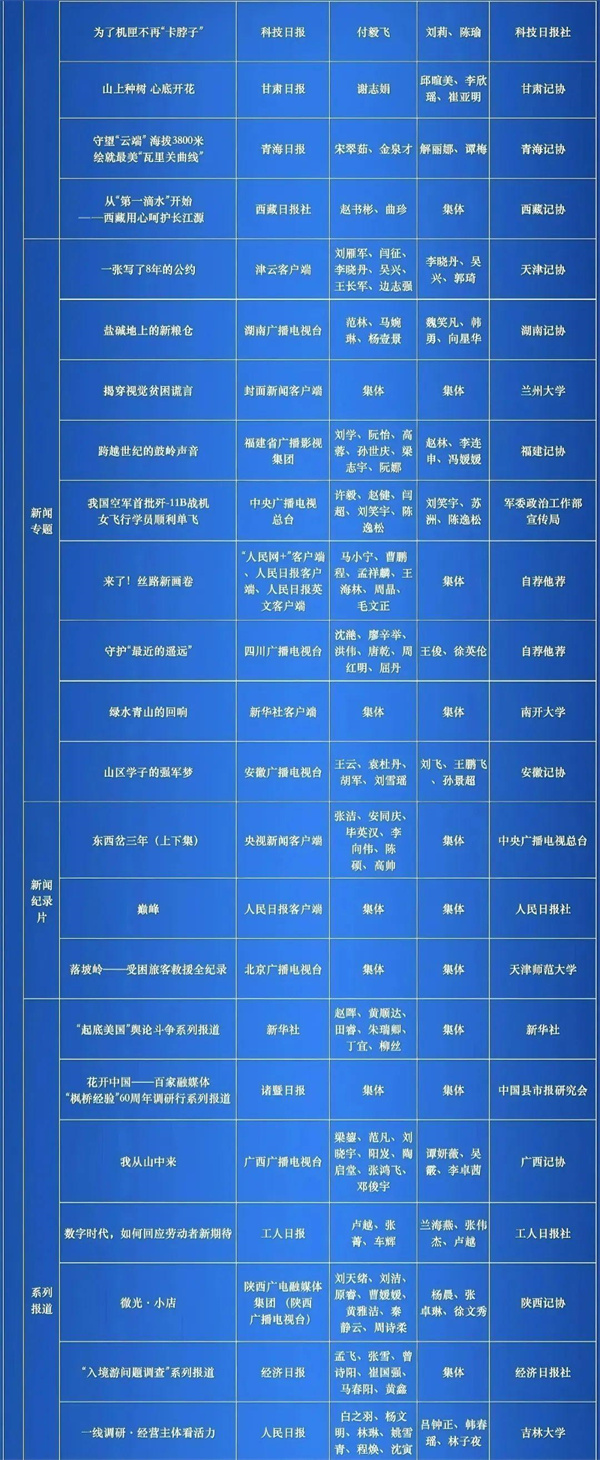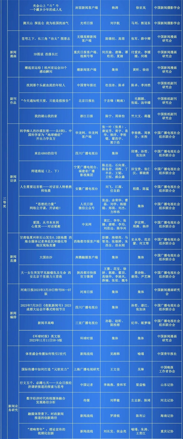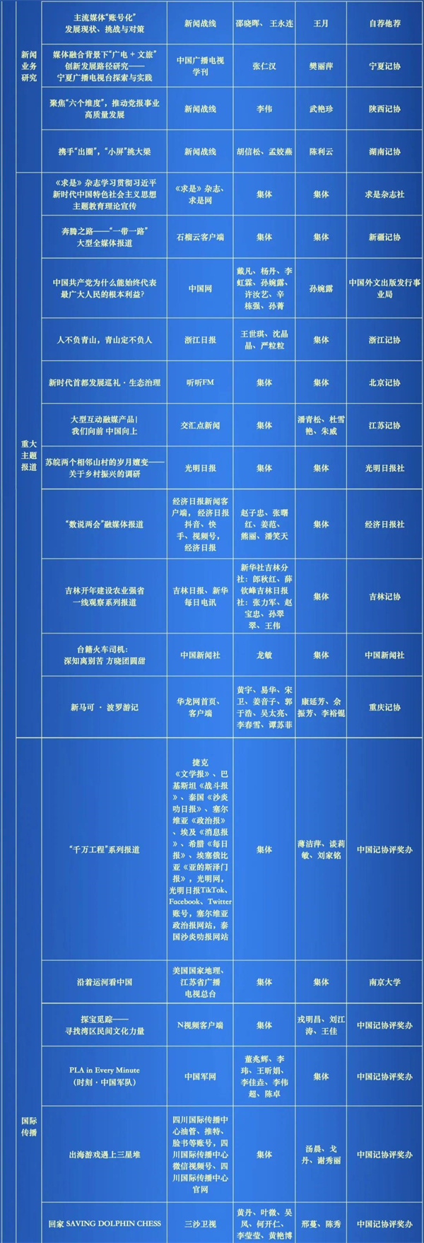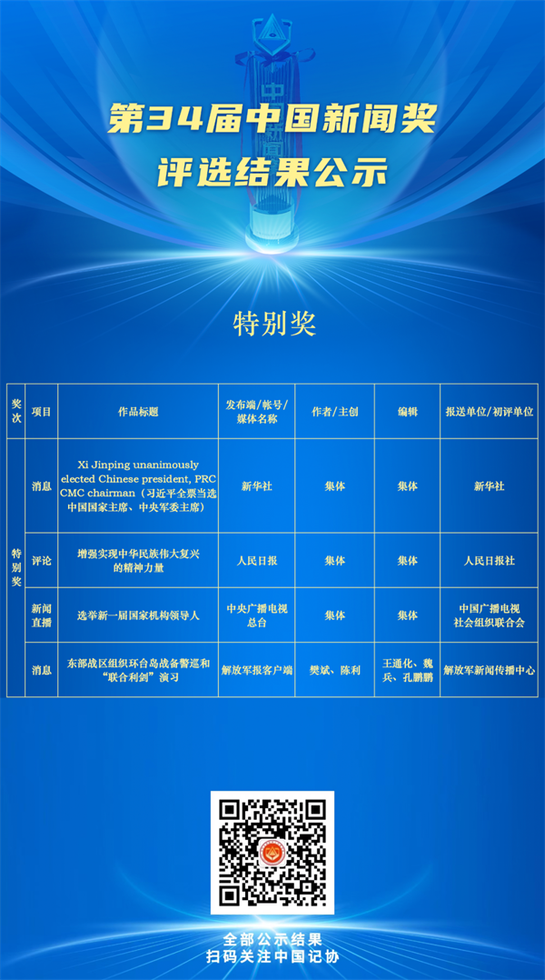 由中華全國新聞工作者協會(簡稱“中國記協”)主辦的第34屆中國新聞獎評選結果自今日起在中國記協微信公眾號、中國記協網公示。本屆擬獲獎作品378件,其中特別獎4件、一等獎75件、二等獎111件、三等獎188件。