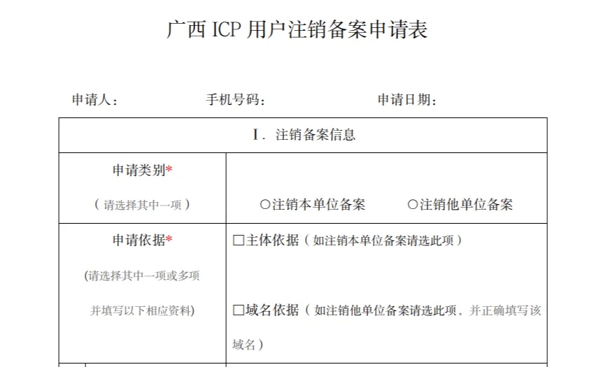 備案注銷需要到備案號當?shù)氐耐ㄐ殴芾砭窒螺d“注銷備案申請表”,按“填表須知”中的要求把申請表里的信息填好,將材料郵寄或送到指定地點即可。處理結(jié)果申請人可自行登錄工信部備案系統(tǒng)“公共查詢”可查詢。以廣西為例: