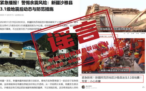 詳情:11月19日,新疆阿克蘇地區(qū)沙雅縣發(fā)生3.1級地震,震中位于農(nóng)田區(qū)域,距離沙雅縣城21.2公里。經(jīng)初步排查,沙雅縣城區(qū)無震感,城區(qū)通訊、供電、交通道路狀況正常,暫未接到人員傷亡和財(cái)產(chǎn)損失情況報(bào)告。但有部分自媒體賬號在網(wǎng)絡(luò)上發(fā)布一些地震廢墟或?yàn)?zāi)后救援等圖片和信息。對此,當(dāng)?shù)鼐W(wǎng)信部門發(fā)布辟謠聲明稱,網(wǎng)傳廢墟和救援圖片并非真實(shí)的地震現(xiàn)場,系某些自媒體賬號罔顧事實(shí)和真相,為博取流量、吸引眼球編造發(fā)布,混淆視聽誤導(dǎo)網(wǎng)民。網(wǎng)信、公安部門鄭重提醒,對編造散布地震謠言擾亂公共秩序、造成惡劣社會影響的行為,公安機(jī)關(guān)將依法依規(guī)嚴(yán)肅查處。(來源:“新疆網(wǎng)絡(luò)辟謠”微信公眾號、阿克蘇網(wǎng)絡(luò)舉報(bào))