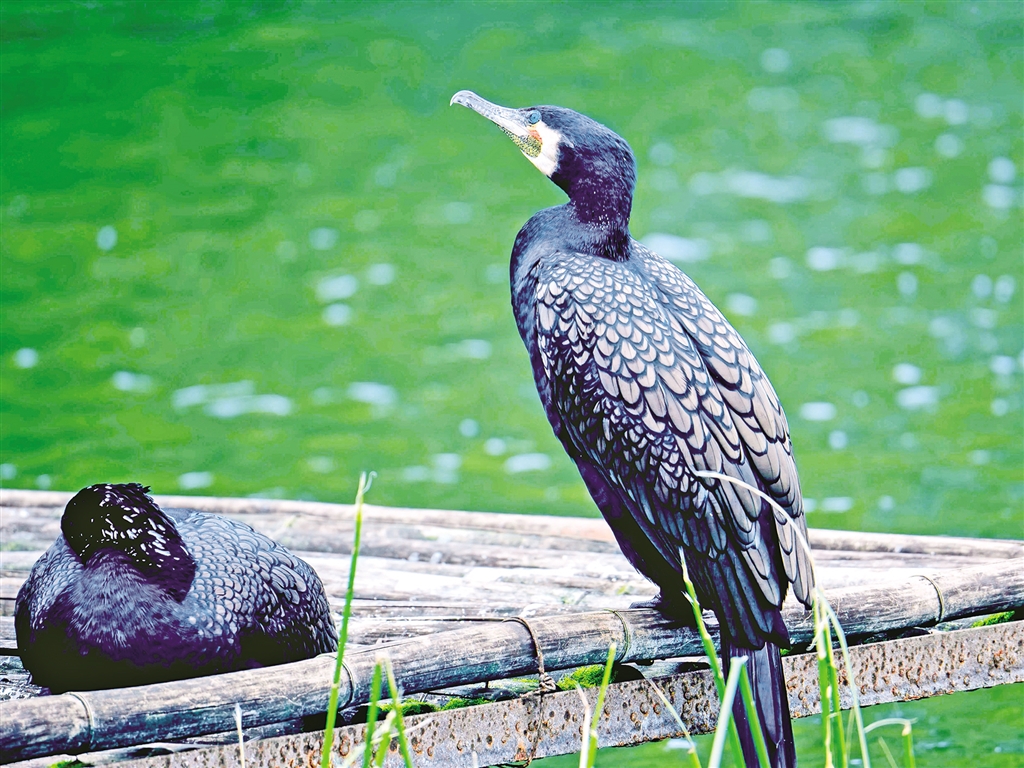 又名水老鴉、魚鷹、烏鬼、黑魚郎等。雌雄同型。通體黑色,有綠褐色金屬光澤;喙厚重,喙基和喉囊橙黃色,臉頰及喉白色;夏羽頸及頭飾具白色絲狀羽,冬羽則消失,兩脅具白色斑塊;亞成鳥深褐色,下體污白。(來源:安康市林學(xué)會(huì))aYP安康新聞網(wǎng)