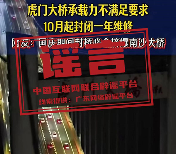 真相:近日,網(wǎng)絡(luò)上流傳“虎門大橋10月起封閉維修”的消息。經(jīng)東莞日?qǐng)?bào)記者核實(shí),該信息不準(zhǔn)確;㈤T大橋在國慶假期期間將正常通行且繼續(xù)實(shí)行免費(fèi)政策。9月29日,廣東虎門大橋有限公司明確表示:虎門大橋在2026年春節(jié)前不會(huì)采取全封或半封措施,具體封閉時(shí)間及方案,目前均未確定。據(jù)悉,此前東莞市發(fā)展和改革局曾發(fā)布過相關(guān)評(píng)估前的公示,其中提到預(yù)計(jì)開工時(shí)間,但并非實(shí)際施工時(shí)間。(來源:“廣東省互聯(lián)網(wǎng)舉報(bào)中心”微信公眾號(hào)、東莞日?qǐng)?bào))