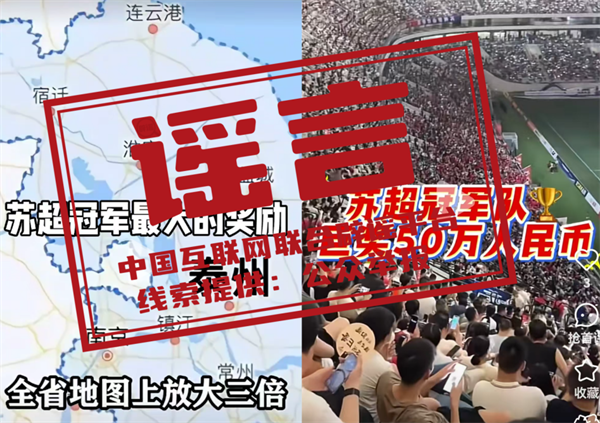 辟謠:地圖放大三個字號?獎金五十萬?這些網傳蘇超冠軍隊獎勵都是假的!