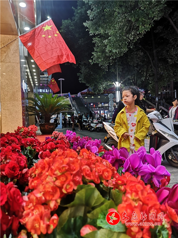 9月30日晚,興安路金州路十字某商家用國慶和鮮花裝飾店面,引得市民駐足。PBy安康新聞網(wǎng)