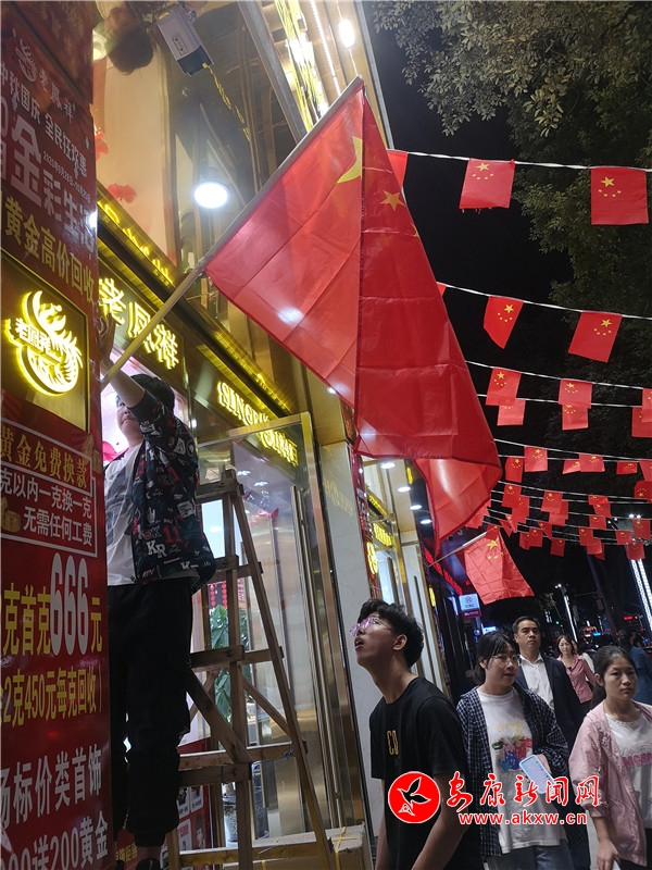 9月30日晚,金州路某商家正在為店面掛國旗。PBy安康新聞網(wǎng)