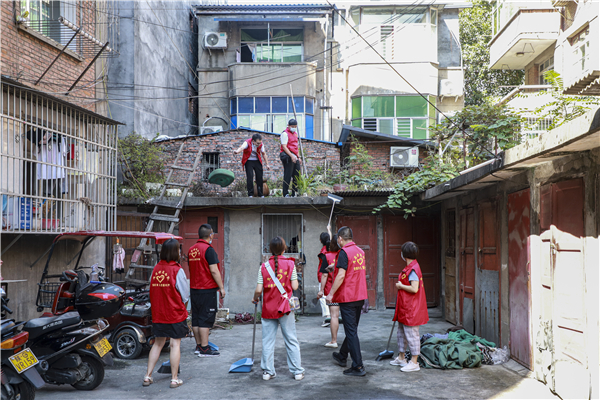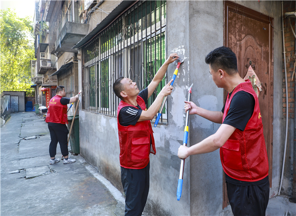 2022年7月21日早上,靜寧社區(qū)領(lǐng)導(dǎo)、工作人員及志愿者;市民政局、市兒童褔?yán)海皇腥藟酃镜葐挝欢寂沙龆嗝ぷ魅藛T,在社區(qū)轄內(nèi)靜寧小區(qū),幫助廢舊垃圾、廣告的清理。v4E安康新聞網(wǎng)