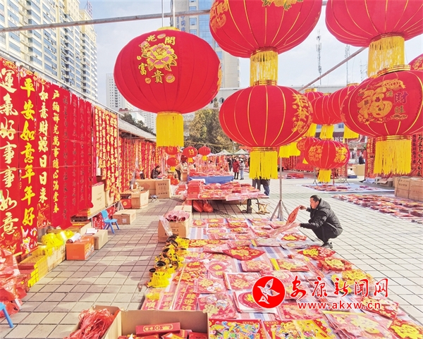 商販在中心廣場(chǎng)售賣(mài)春聯(lián)、福字、紅燈籠等節(jié)慶用品。吳定國(guó) 攝