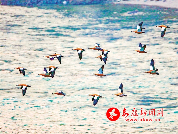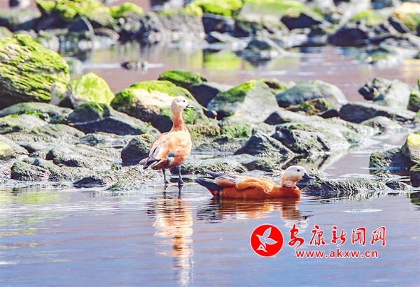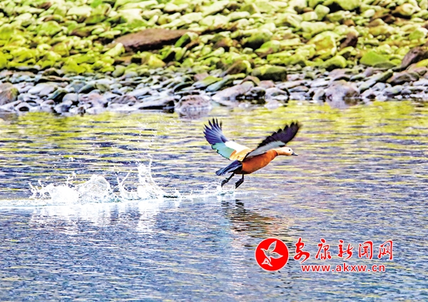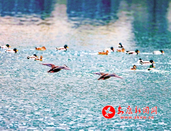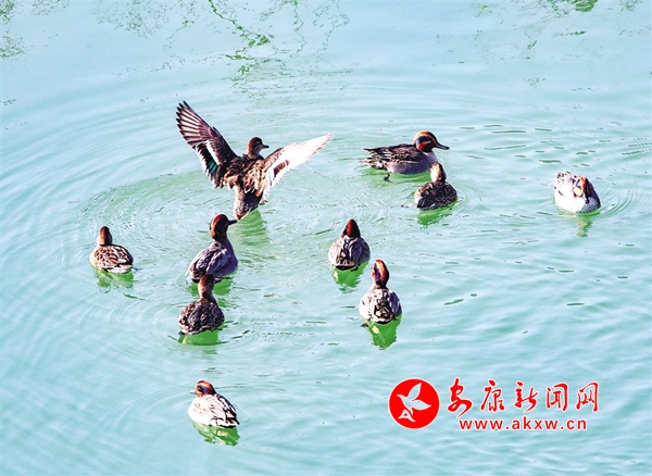 通過攝影鏡頭觀察發(fā)現(xiàn),在大片野鴨群中有綠頭鴨、斑嘴鴨、赤麻鴨等數(shù)10個種類。它們在這里和諧相處,像一個個小精靈悠閑自得。一群群野鴨在河里時而相互追逐,時而潛水覓食,一會兒游上岸邊休息,一會兒展翅飛翔劃過湛藍(lán)的天空,一幅人與自然和諧共生的美麗畫卷在石泉徐徐展開。