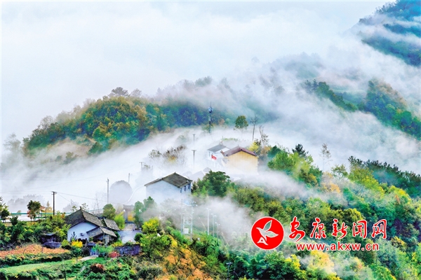 石泉縣城關(guān)鎮(zhèn)楓樹村云霧繚繞。楊勇 攝