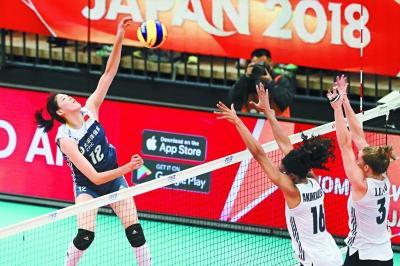 李盈瑩(左)在比賽中扣球。 新華社發(fā) 本報名古屋電(京報體育記者 孔寧)昨天下午,2018年女排世錦賽六強(qiáng)決戰(zhàn)首回合在日本名古屋綜合體育館打響,中國女排在大……