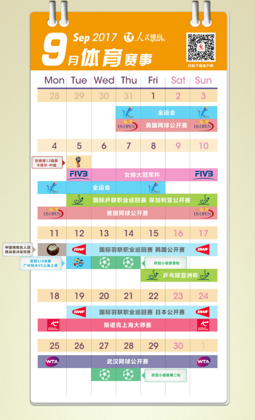 9月賽歷姍姍來遲,因為全運會的報道,耽誤了賽歷的發(fā)布,小編在此先給您鞠個躬,致個歉。9月的重點賽事相當(dāng)多,除全運會外,還有國足的最后一場12強賽,中國隊2-1擊敗卡塔爾,雖然沒能最終出線,但國足的進步我們有目共睹,相信他們會越來越好。四年一屆的女排大冠軍杯在9月10日結(jié)束,中國女排以全勝的戰(zhàn)績奪冠,時隔16年再次捧起大冠軍杯,令人振奮;同一天,美國網(wǎng)球公開賽也落下帷幕,納達爾和斯蒂文斯分獲男女單打冠軍,恭喜他們。