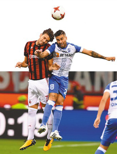 | 8月3日,在意大利米蘭進(jìn)行的歐聯(lián)杯資格賽第三輪次回合比賽中,意甲AC米蘭隊(duì)主場(chǎng)以2∶0戰(zhàn)勝羅馬尼亞克拉約瓦大學(xué)隊(duì)。圖為兩隊(duì)球員在拼搶。 |