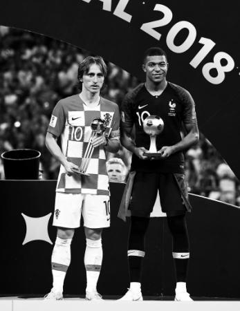 世界杯最佳球員莫德里奇(左)和最佳新人姆巴佩在頒獎儀式上。(新華社發(fā))