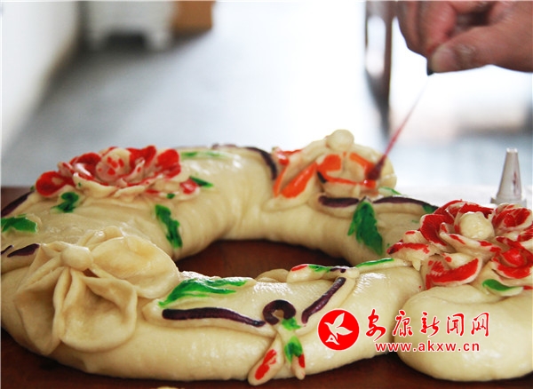 “做花饃先要做饃盤(pán)(基座),饃盤(pán)可大可小,一般有兩個(gè)饅頭大,然后將發(fā)酵好的面團(tuán)用手捏、用剪刀剪成各種花兒和鳥(niǎo)兒等圖案作為饃頂,如果面太軟,或者圖案太大,還需要用牙簽或者較大的竹枝從饃頂部插到饃盤(pán)上,以便固定不變形,最后放在籠屜上,蓋鍋后用大火蒸,待出鍋即成為造型生動(dòng)的花饃。最后再進(jìn)行上色,花饃形狀最多的是喜鵲、龍、鯉魚(yú)等,造型喜慶寓意吉祥。” 花饃技藝傳承人胡志霞說(shuō)道。