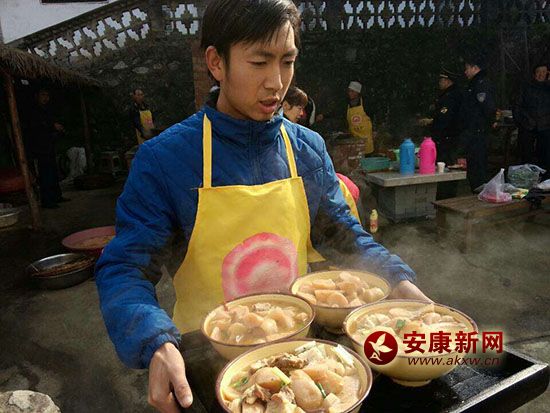 ■ 黃平安“庖湯”, 也有人寫作“泡湯”!芭轀辈皇恰俺燥埡葴保膊皇恰皽厝菰琛,它是陜南農(nóng)家冬季殺年豬時用現(xiàn)殺的豬肉為主料做成的宴席,農(nóng)家用它宴……