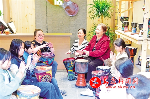 國(guó)慶期間,漢陰雙河口古鎮(zhèn)游客爆滿。圖為游客在古鎮(zhèn)手鼓店體驗(yàn)打手鼓。陳浩 攝