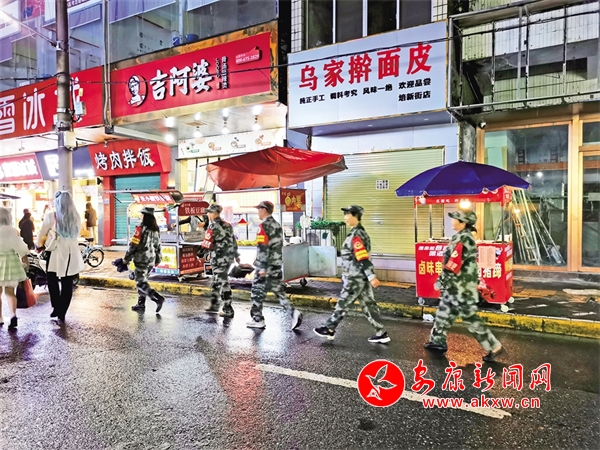 10月1日,志愿服務(wù)隊(duì)在中心城區(qū)培新街開(kāi)展夜間巡邏。潘潤(rùn)生 攝