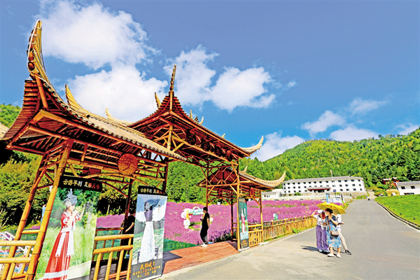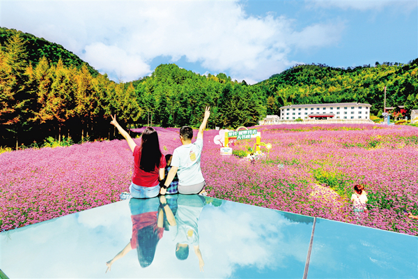 中秋節(jié)期間,平利千家坪森林公園天書峽馬鞭草花競相怒放。如畫的景色吸引眾多游客前來賞景打卡。(詹永桂 攝)7NW安康新聞網(wǎng)