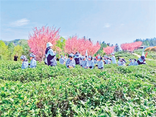 飯后陽(yáng)光漫過茶壟的剎那,茶園正鋪展著千年的風(fēng)雅。我迫不及待換上采茶圍裙踏入皇茶園,體驗(yàn)采茶、做茶的樂趣。指尖輕捻“一芽一葉”的嫩綠,在古法炭焙的鐵鍋里翻涌著時(shí)光的溫度,待山泉水與雀舌相遇時(shí),茶香便化作裊裊云煙,在青瓷盞中演繹生命的涅槃。