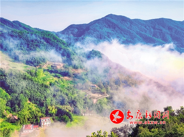 時暑不出門,亦有賓客至。時值大暑,赤日炎炎,山道彎彎,遠處云霧繚繞,近處山林蓊郁,這里是群山環(huán)抱的壩河!