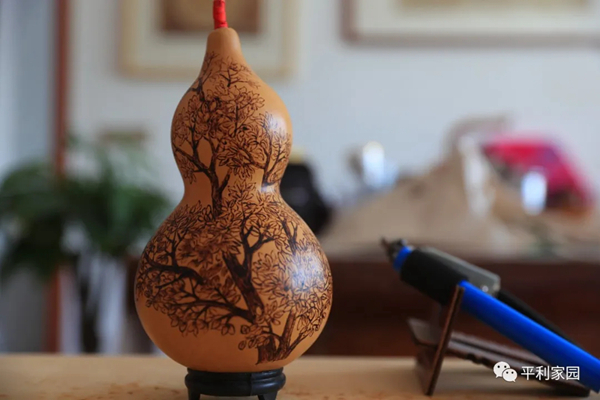 一組葫蘆,明黃里透出古色,熠熠生輝的畫幅里,平利雄山秀水滴滴溢出,一時(shí)間,香氣四溢,鄉(xiāng)風(fēng)彌漫,整個(gè)房間便裝滿女媧故里平利的山山壑壑。