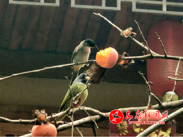 山垰間,一樹(shù)焰火似的紅柿子,掛在天穹,迎風(fēng)搖曳,恰巧,兩只山雀停住枝丫間,兩眼凝視啄開(kāi)紅彤彤的鮮瓤,不知道是望柿,還是炫酷孤傲的“旺勢(shì)”,樣子煞是迷人。