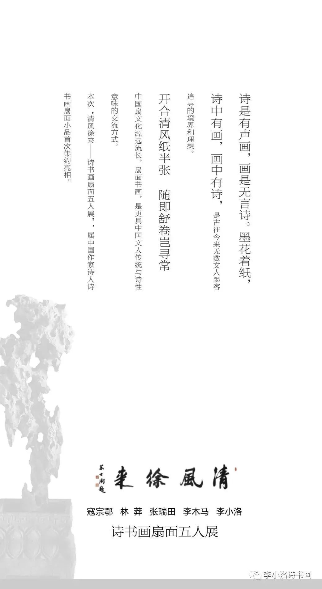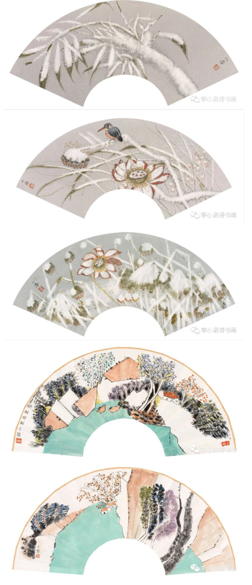 詩人寇宗鄂和林莽,均為《詩刊》編委,都曾擔(dān)任過《詩刊》的編輯部主任?茏诙踉鴰煆闹剿嫾倚毂蓖,詩人牛漢,詩畫兼擅。林莽作為白洋淀詩群和朦朧詩重要代表詩人,詩畫相融,桃李天下。張瑞田早年寫詩,后來多寫散文和書畫評論,是當(dāng)今活躍的評論家和書家。李木馬,李小洛,都曾參加過《詩刊》社的“青春詩會”,就讀魯迅文學(xué)院高研班,在詩歌和書畫創(chuàng)作上多年努力,取得了一定的成績……一人一格、一人一品,一扇一意、一扇一味,五位詩人作家的詩意筆墨,傳遞著各自對生活、藝術(shù)與世界的熱愛,認(rèn)知與發(fā)現(xiàn)。君子和而不同,透過一幀幀詩意盎然的扇面小品,在交相輝映的筆情墨趣中,可以看到他們相互啟迪,感染和照亮的友誼與藝術(shù)追求。