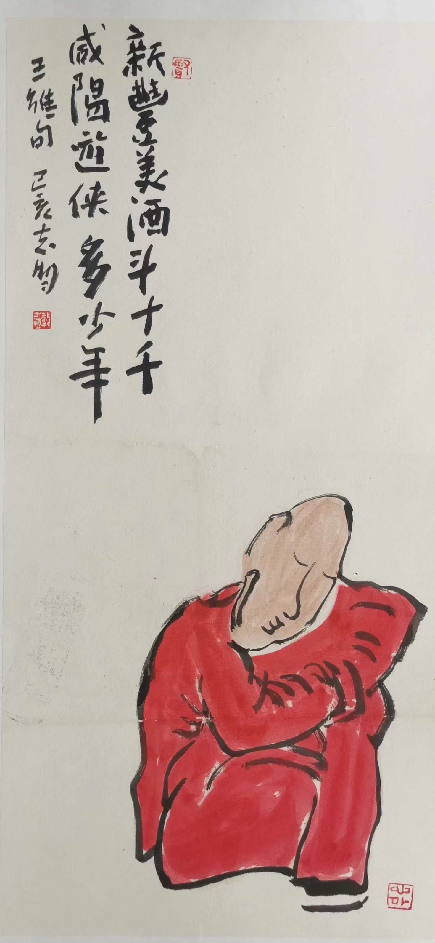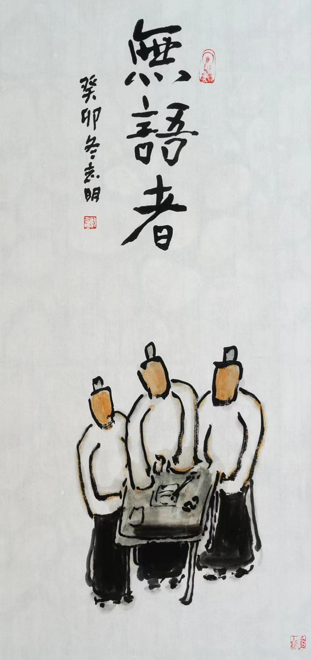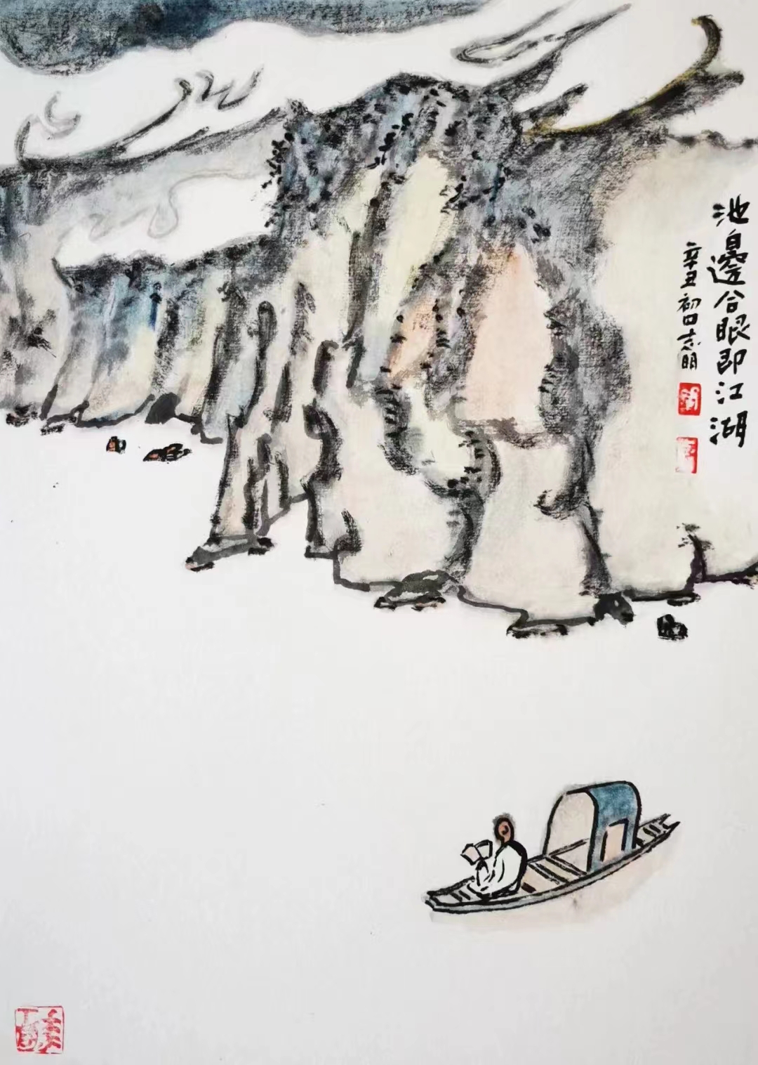 記得那一年的端午節(jié),鞏志明發(fā)來短信,是他寫的一首詩:綠粽黃酒聚江邊,白帆紅燭祭屈原。三千清淚流不得,九萬渾念飄上天。誰有郁悶誰散淡,何謂圓滑何忠奸。十丈風(fēng)塵古今在,談笑真?zhèn)位聼煛?017年,我遷新居,鞏老師為我寄來小品畫《福到眼前》,我很喜歡,并懸掛至新居玄關(guān)。這些年,鞏志明老師常做影展畫展策劃及影評(píng)講座,自已也臨池不輟,水墨丹青,寄情抒懷,他的文人小品有思想性、有創(chuàng)造性。雖畫的是松風(fēng)明月,小舟流水或遠(yuǎn)古人物,但都寄托了他當(dāng)下的心境,以消塊壘。誠如有人評(píng)論他為“吾師真文人,畫亦真性情!”他不僅只是身居畫室的怡情文人,他亦是心憂天下的豪俠。面對世間不平事,他也是激揚(yáng)文字,揮斥方遒!在功利的當(dāng)下,鞏志明尤其顯得難能可貴!