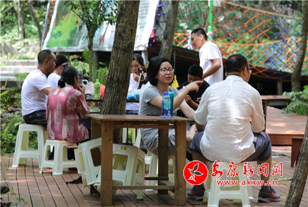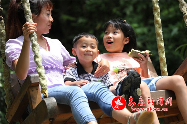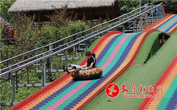 往來翕然,游人如織。幾個稚童像百靈般迅捷,雀躍的身影在青竹翠蔓間穿梭,很快便隱沒了身形,只余下串串清脆的歌聲,與林間蟬鳴一唱一和。妙齡姑娘,隨性地從五彩滑道旋轉直下,如履云端,恍若驚鴻。柔情脈脈的戀人,安享著山澗的幽靜,互訴衷腸,期冀著美好的未來。